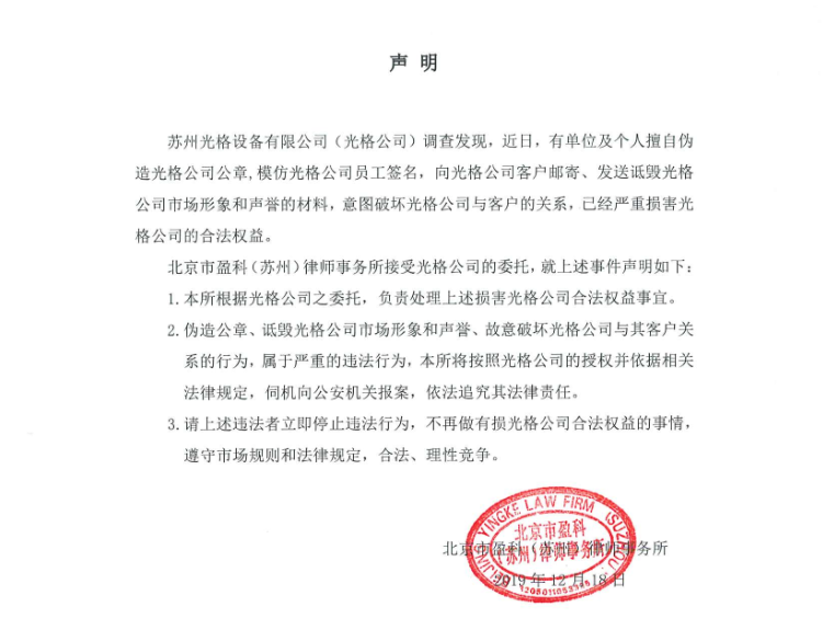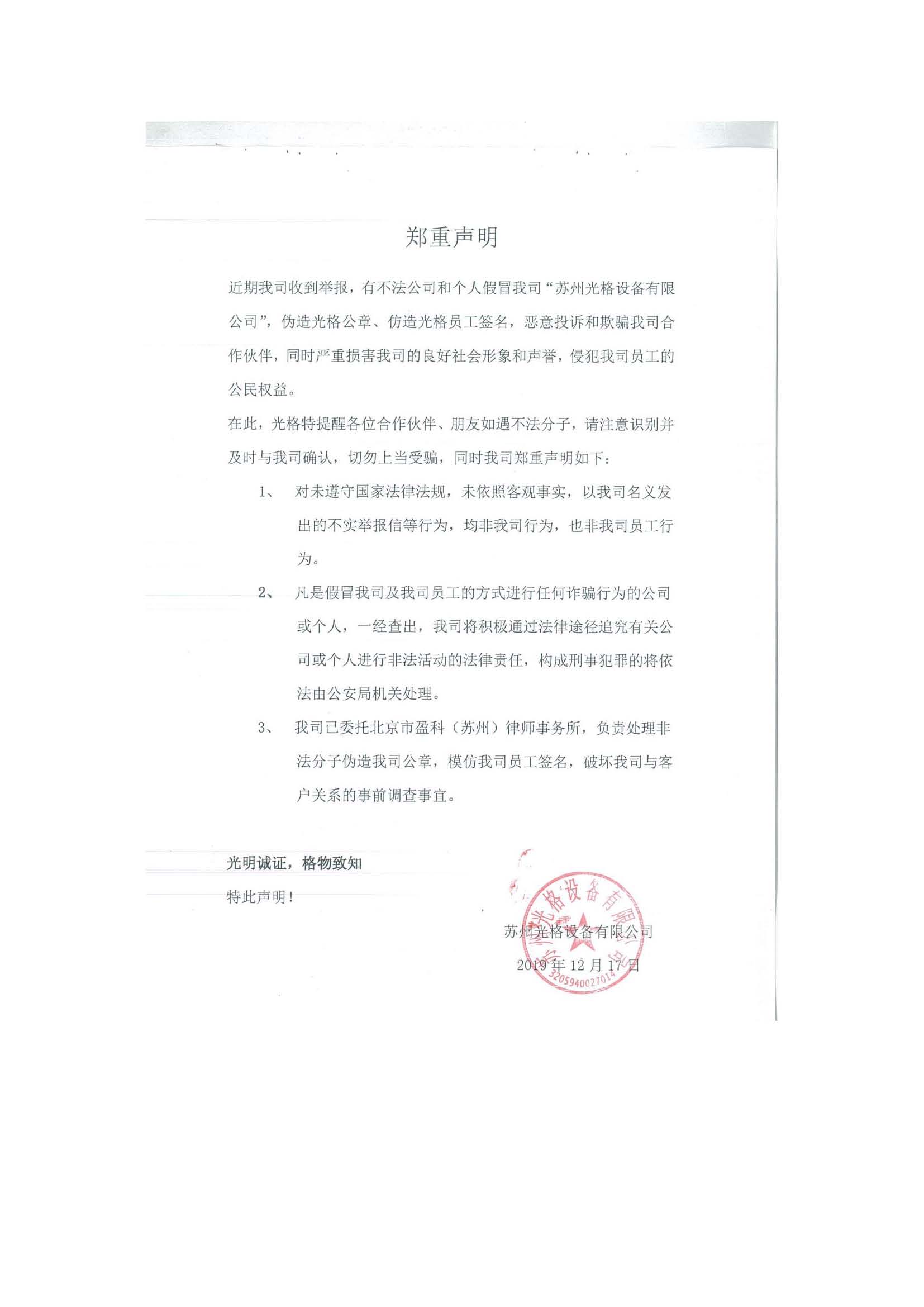 近期我司收到舉報,有不法公司和個(gè)人假冒我公司“蘇州光格設備有限公司”名義,偽造光格公章,仿造光格員工簽名,惡意投訴和欺騙我司合作伙伴,同時(shí)嚴重損害我司的良好社會(huì )形象和聲譽(yù),侵犯我司員工的公民權益。